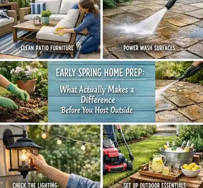 Preparing a home for outdoor hosting in early spring does not require major renovations. The most meaningful improvements come from realistic, high-impact steps: Cleaning out the seating area, renewing furniture, fixing walkways, improving the front entrance, and reconditioning surfaces.